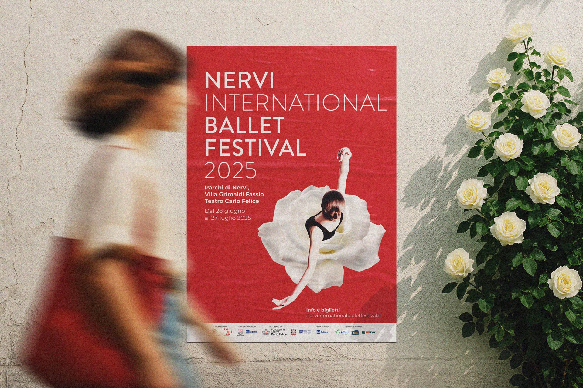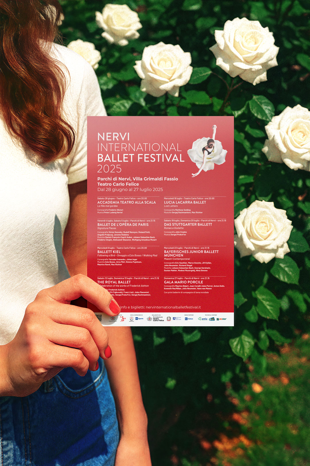 È stata una rosa ad ispirarci Il nostro progetto di brand identity si è ispirato a una rosa. Infatti, a Nervi, nell’importante complesso botanico nel quale il Nervi International Ballet Festival si svolge, c’è un roseto che nella sua storia ha vantato più di duecento varietà di quel fiore. Da qui l’ispirazione: una rosa come il vestito di una danzatrice, un tutu floreale. Ecco come una soluzione grafica diventa segno identitario.